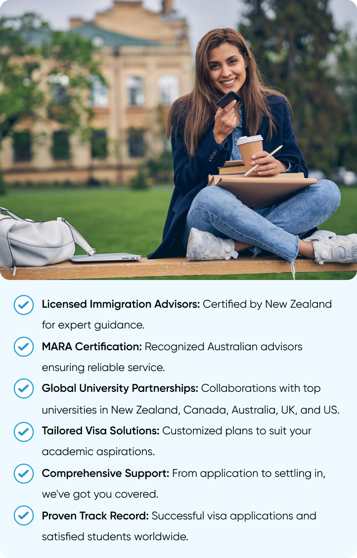 Trust our licensed immigration advisors and MARA-certified experts to navigate your study visa journey. With top university tie-ups in New Zealand, Canada, Australia, UK, and the US, we provide comprehensive support tailored to your academic goals. Our proven track record speaks for itself, ensuring your successful transition to global education.